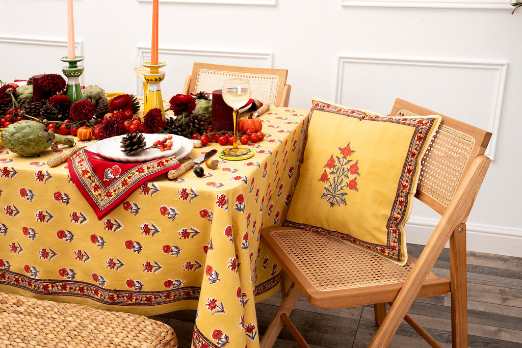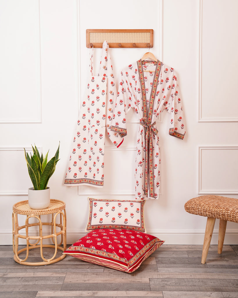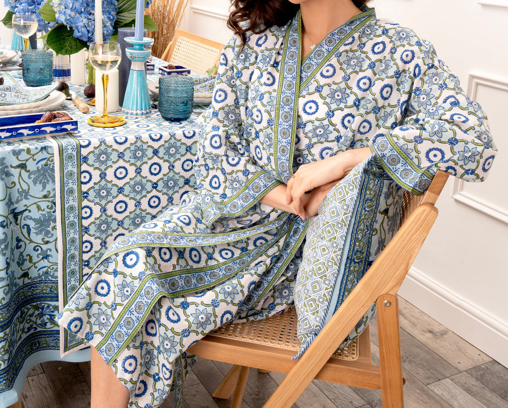 Colours that move from dawn to dusk in block-printed designs created to mix and match. Create show-stopping tables with exquisitely crafted linens and pottery, re-imagine your spaces for relaxation with stylish cushion covers or treat yourself to robes, bags and slippers in our beautiful prints.
