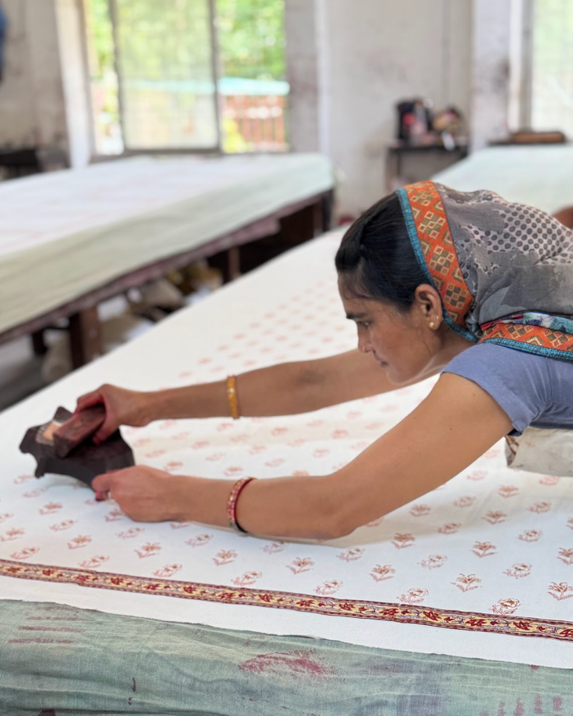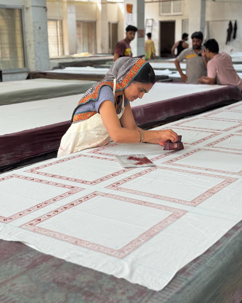 The block is dipped in natural dye and pressed firmly onto cloth. With each measured impression, the design slowly emerges - rhythmic, precise, and alive with human touch.