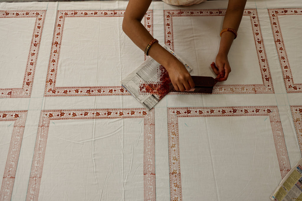 Every print begins with a block. Skilled artisans carve intricate motifs into teak or sheesham wood, chiseling details by hand to create tools that will be used for years, sometimes generations.
